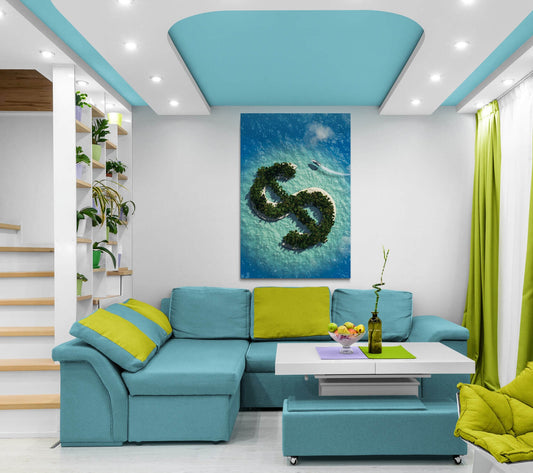Dollar Island Canvas Financial Money Acrylic or Metal Print Blue Ocean Beach Art Vacation Wall Poster Yacht Money