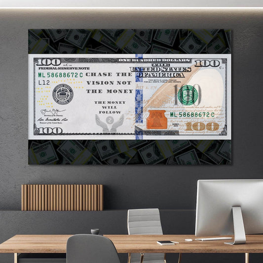 Chase the Vision Not the Money and the Money Will Follow $100 Dollar Bill Canvas Motivational Wall Art