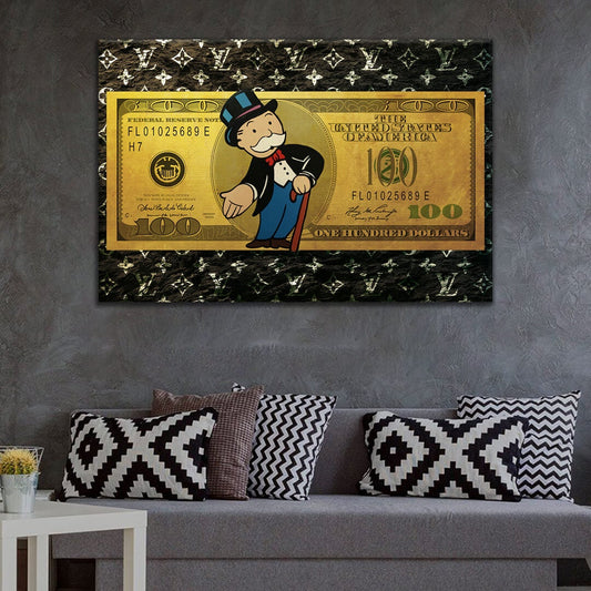 Elevate Your Space with Alec Monopoly LV US Dollar Pop Art Wall Decor - Gold Style Print on Luxury Canvas Featuring Uncle Sam