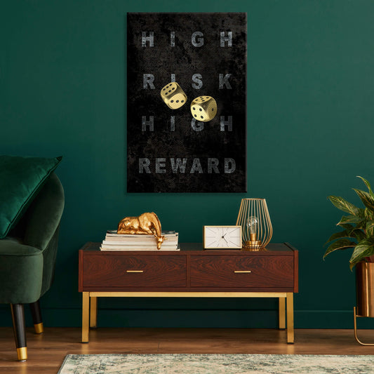 High Risk High Reward Canvas Gold Dice Gambling Acrylic or Metal Print Entrepreneur Art Business Wall Poster Black and Grey Game Room