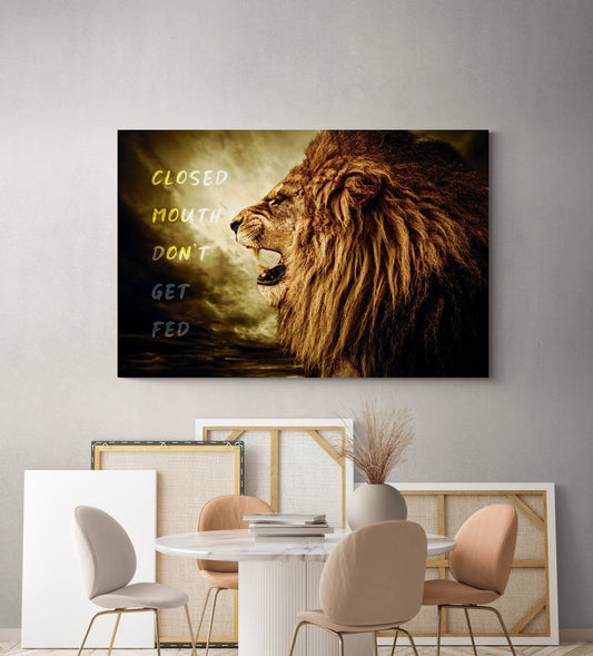 Closed Mouth Don't Get Fed Canvas Lion Motivational Quote Poster Inspirational Sign Office Art