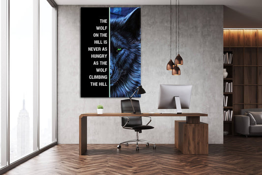 Motivational Canvas Quote - Wolf Art: "The Wolf on the Hill is Never as Hungry as the One Climbing the Hill"