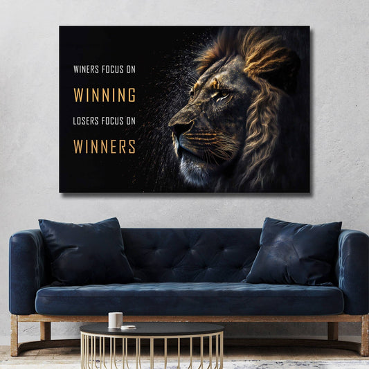 Motivational Wall Art - "Winners Focus on Winning" Inspirational Quote Poster - Lion Head Print - Entrepreneur Canvas Competition Office Print