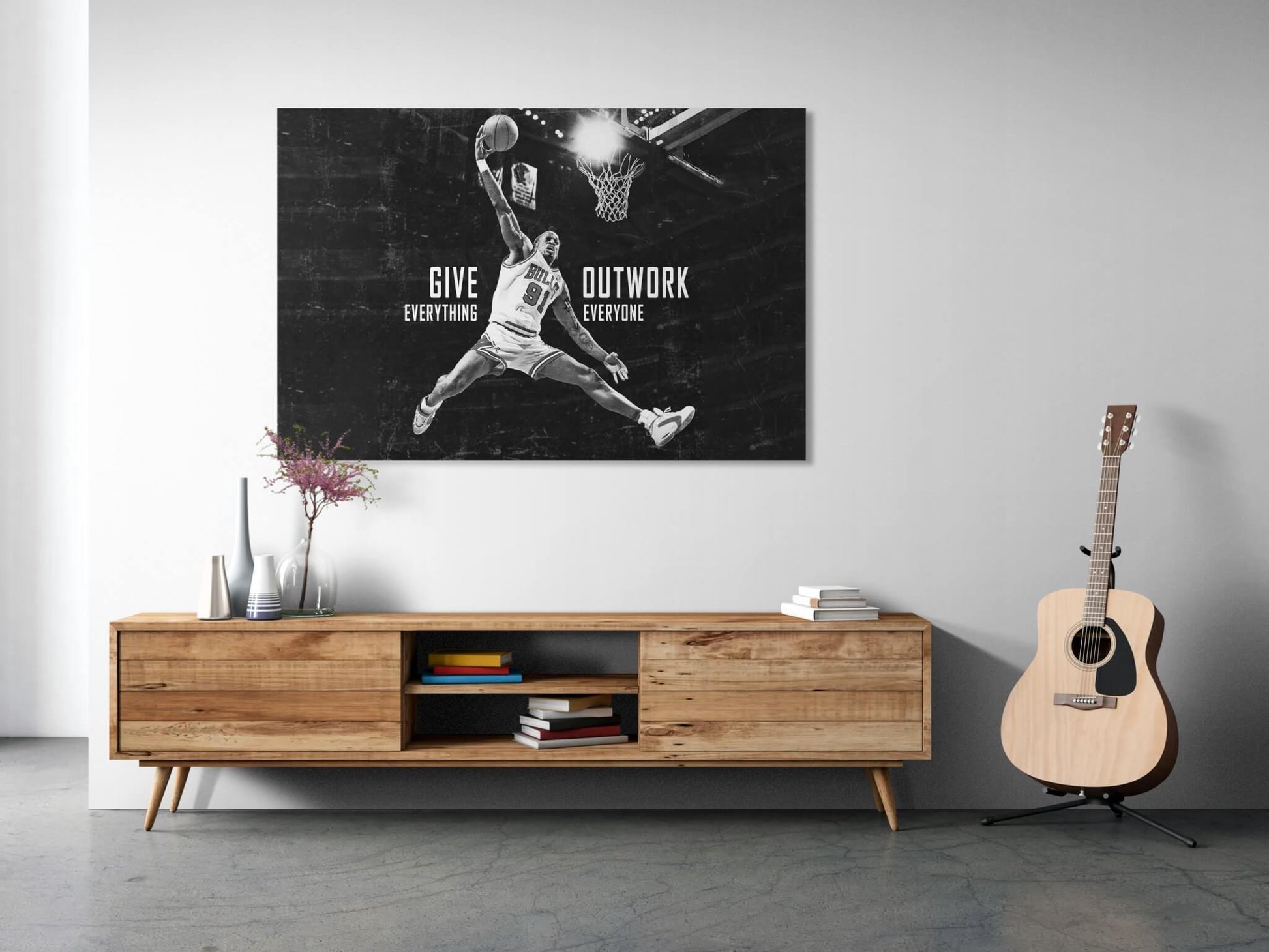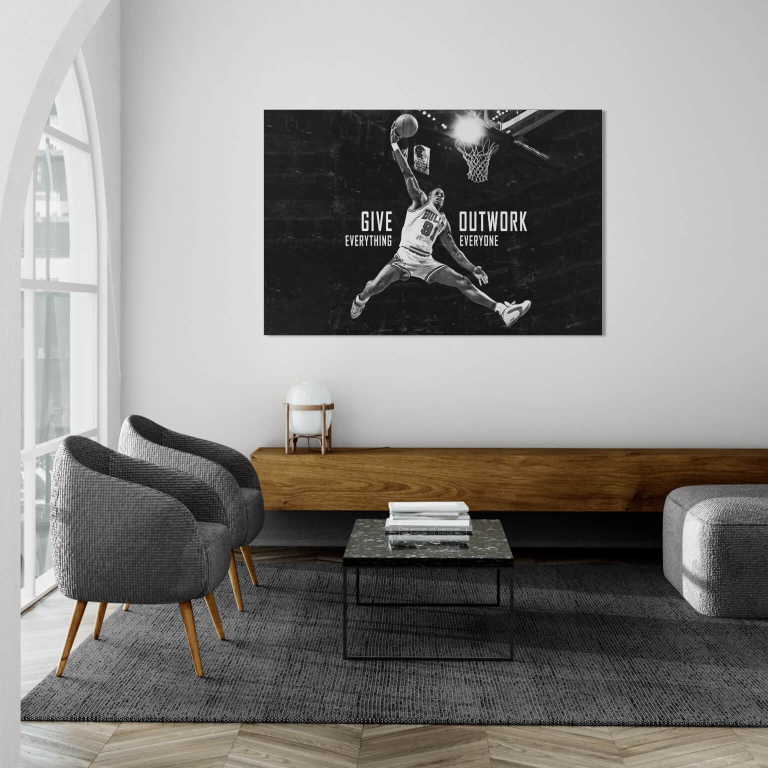 Dominate every challenge with this powerhouse Dennis Rodman canvas print, blasting "Give Everything Outwork Everyone" as a rallying cry from the NBA's ultimate enforcer. Celebrating Rodman as the basketball player of all time and super star, this inspirational sports poster ignites motivational wall art in your gym, office, dorm, man cave, or home—turning ordinary spaces into arenas of relentless drive and victory.